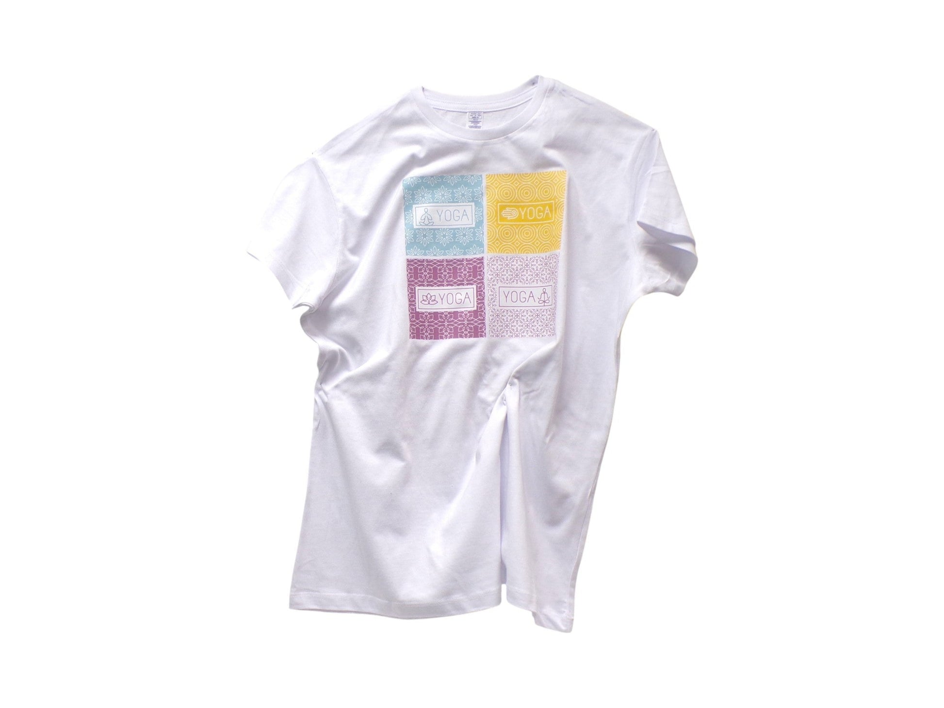 Camiseta de estilo amplio para mujer con dibujo de yoga en el delantero.