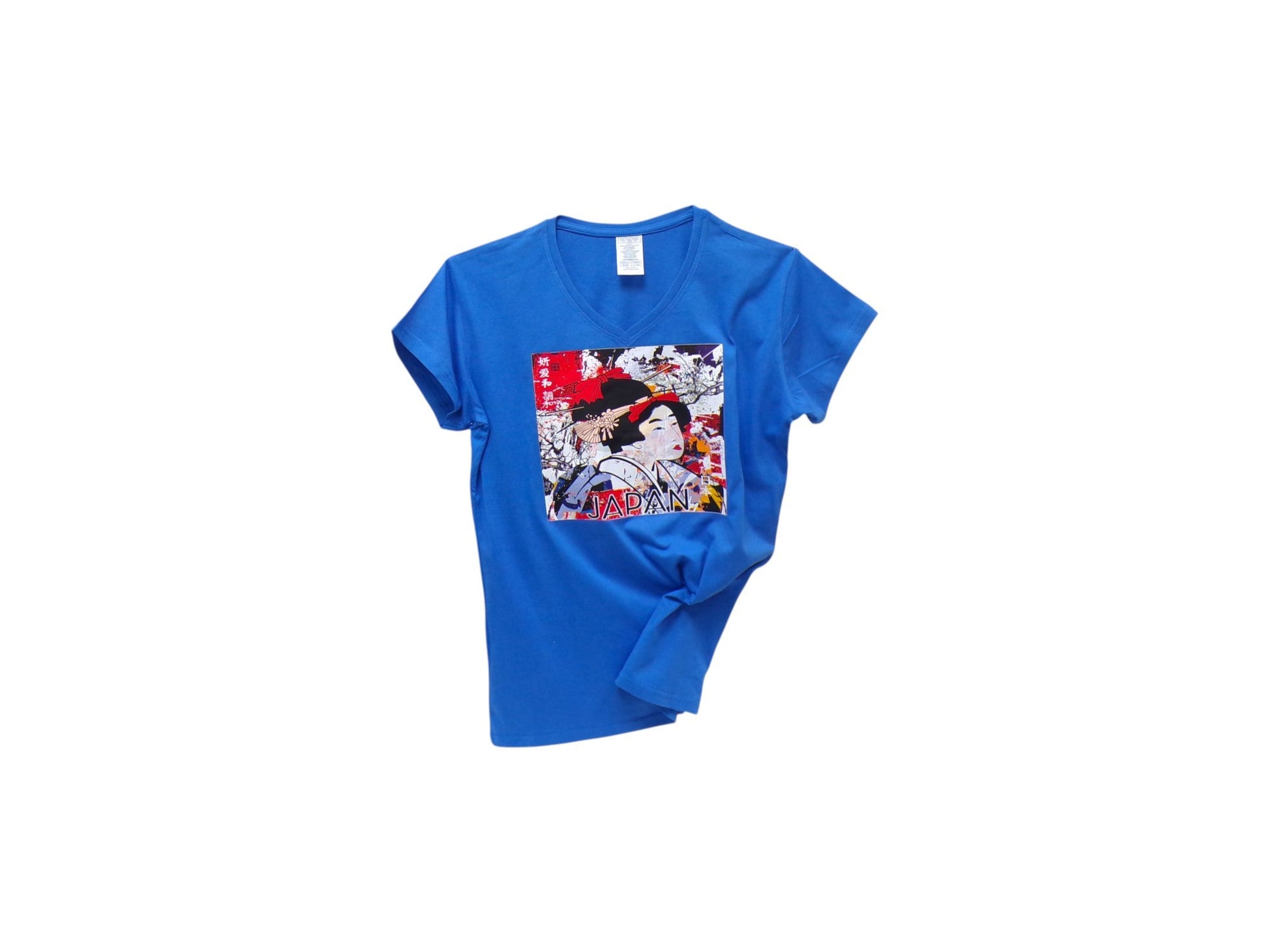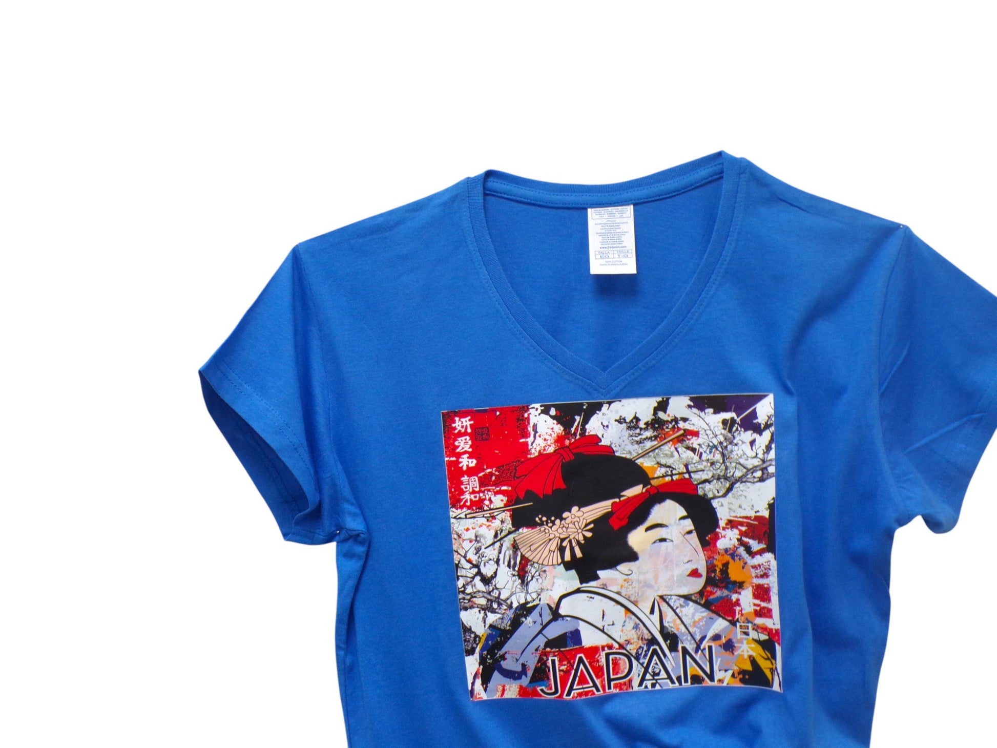 Camiseta entalla para mujer cuello pico y dibujo de gueisa en colores en el delantero.