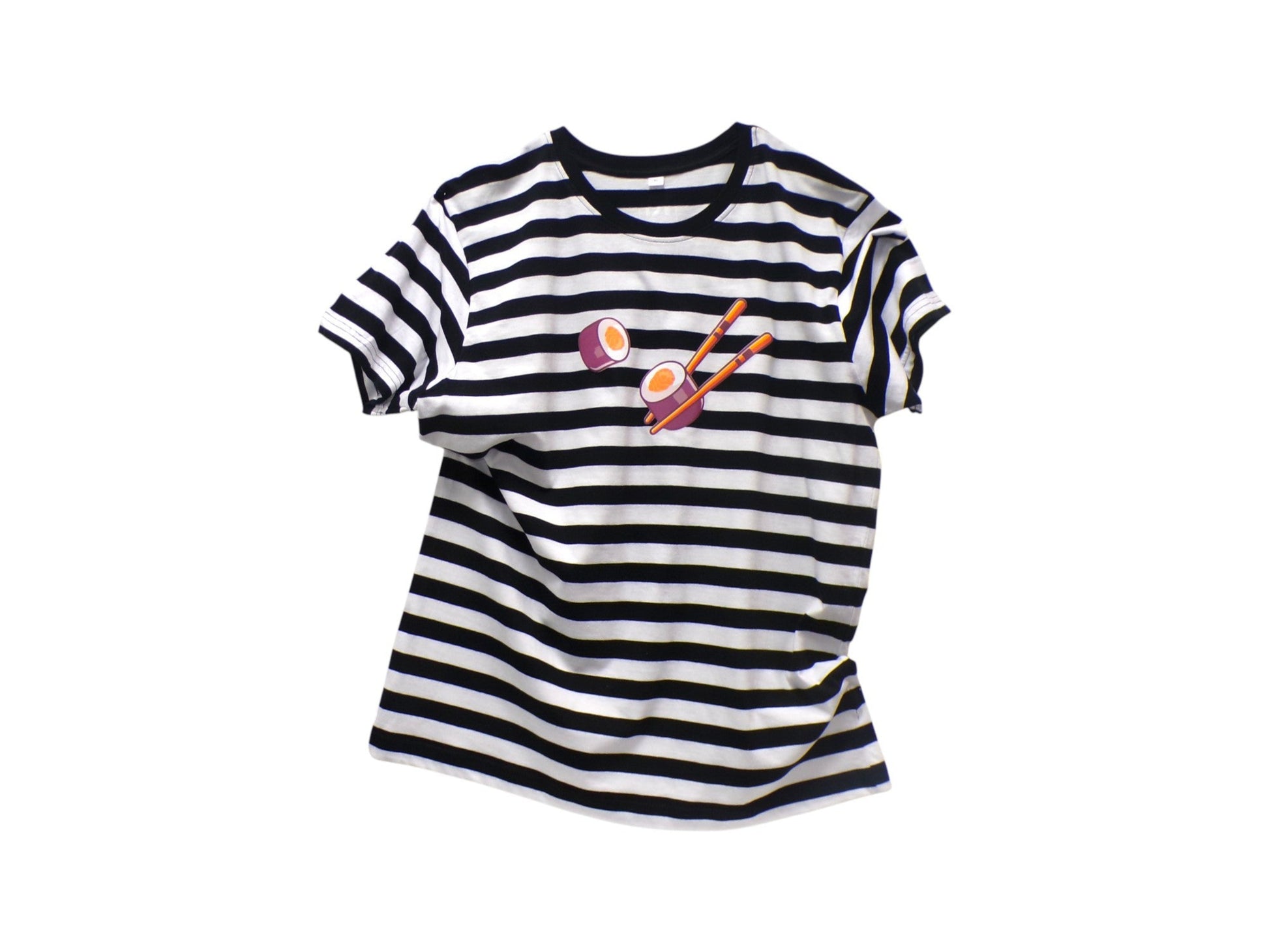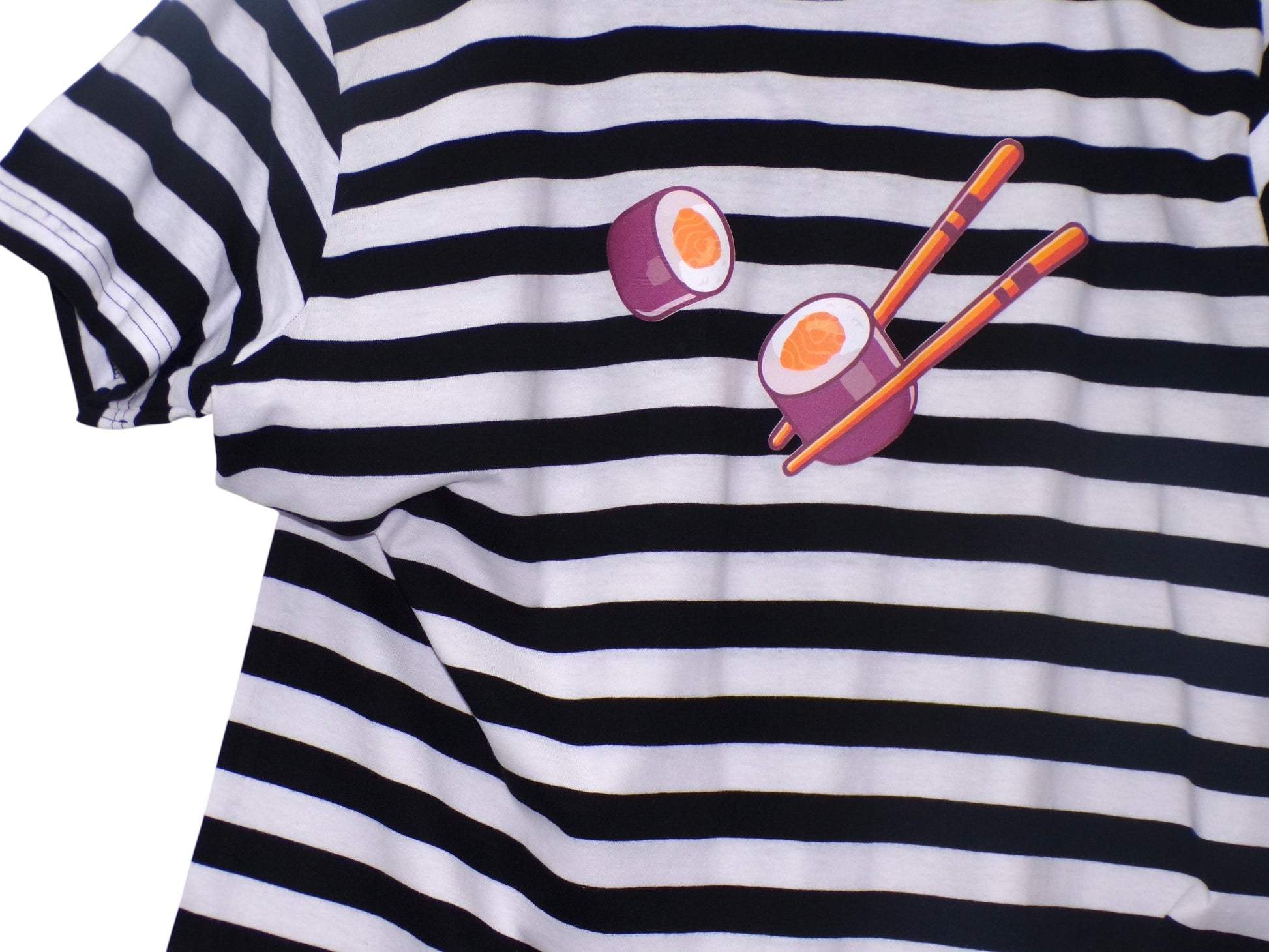 Camiseta de algodón a rayas blancas y negras, con dibujo de sushi.