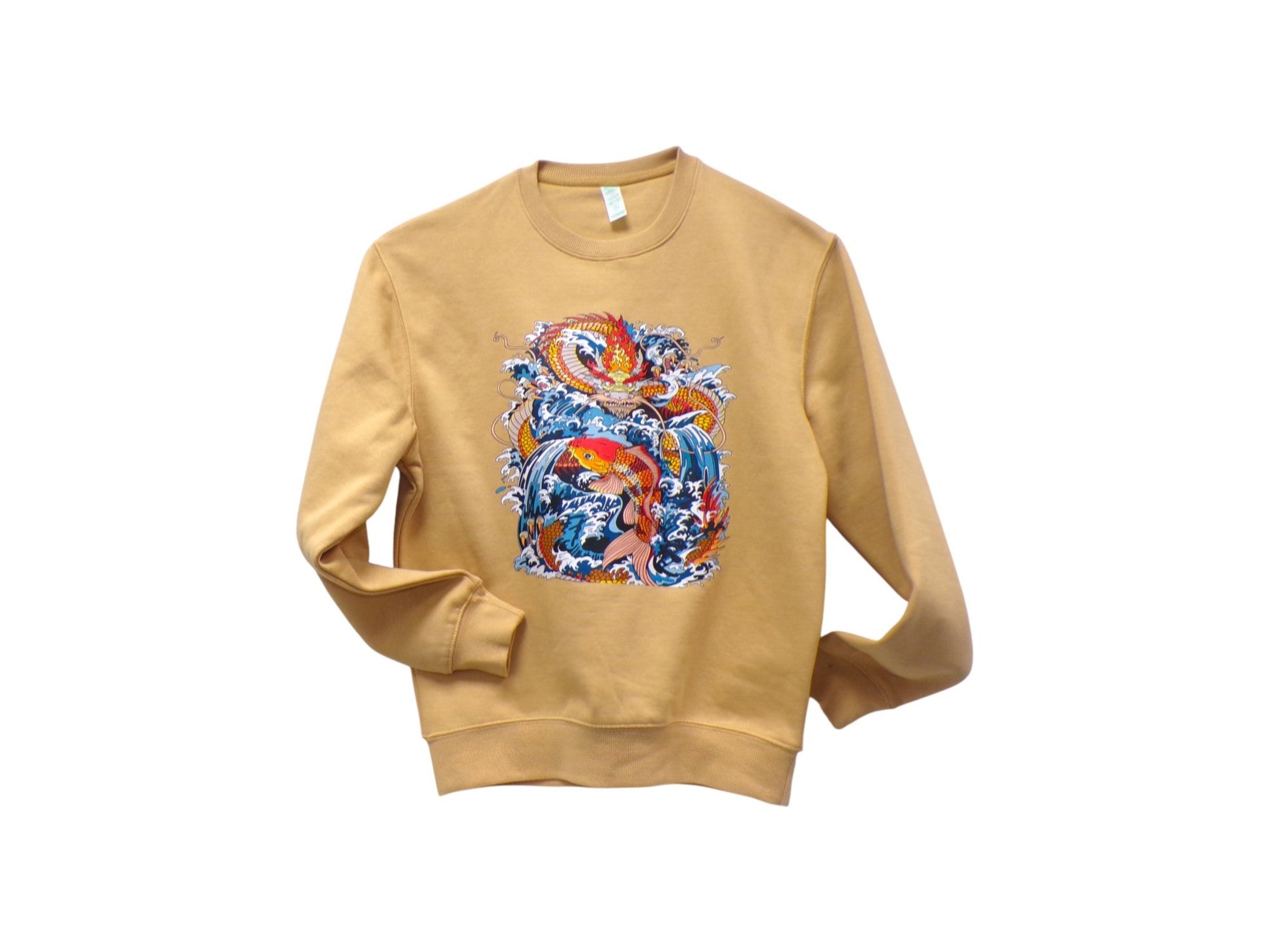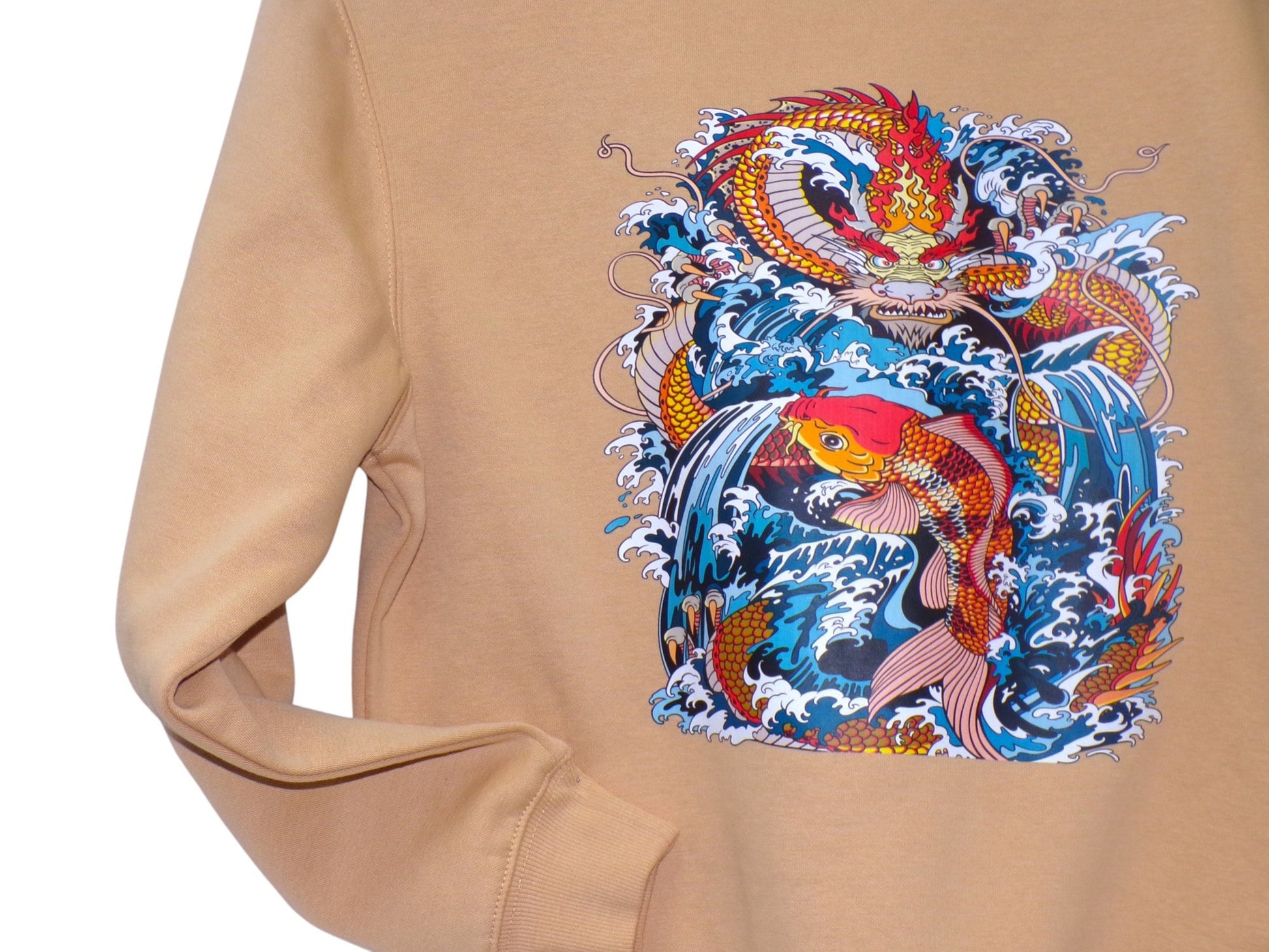 Sudadera unisex con dibujo de dragón y carpa en el delantero.